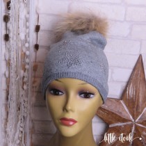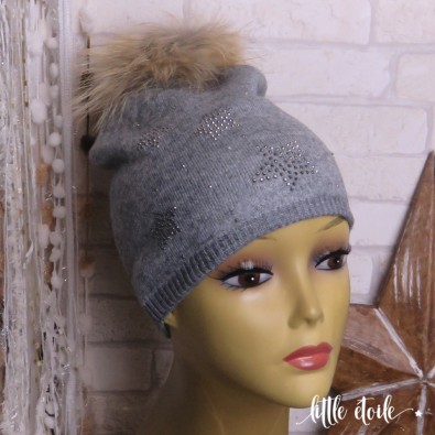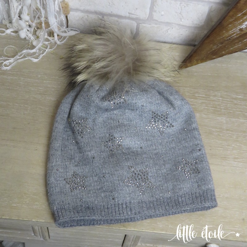 Bonnet laine Etoiles en strass, pompon fourrure, gris clair