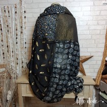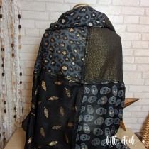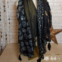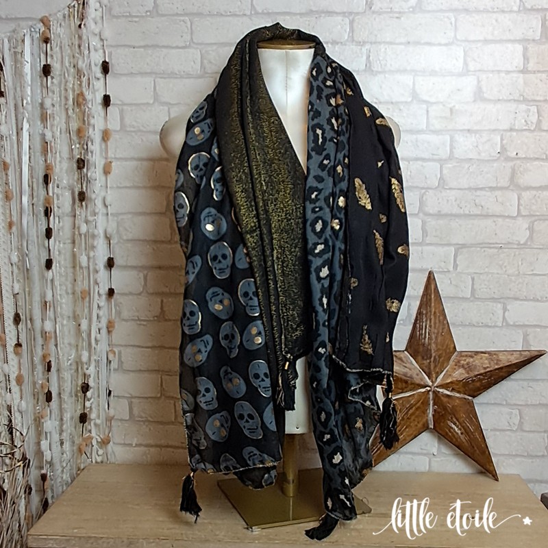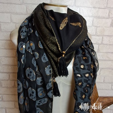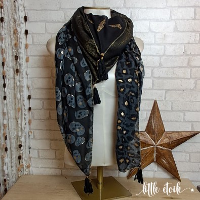 Grand Foulard viscose en patchwork avec pompons, Tête de mort, Plumes imprimé léopard & doré, noir