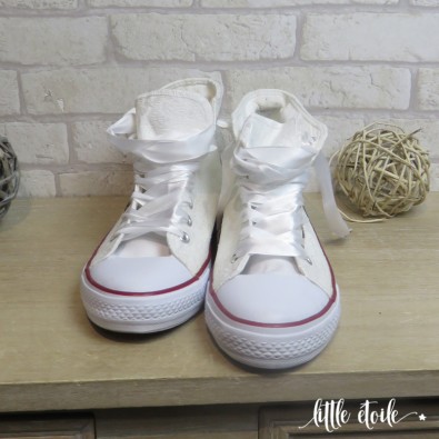 Ce modèle est dans une matière satinée esprit dentelle, vendue avec une seconde paire de lacets en satin blanc