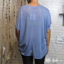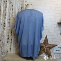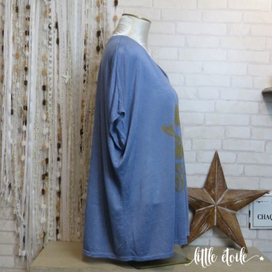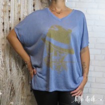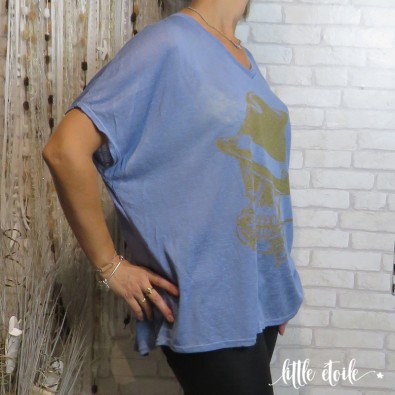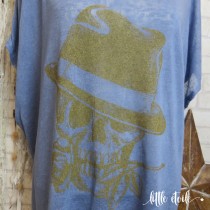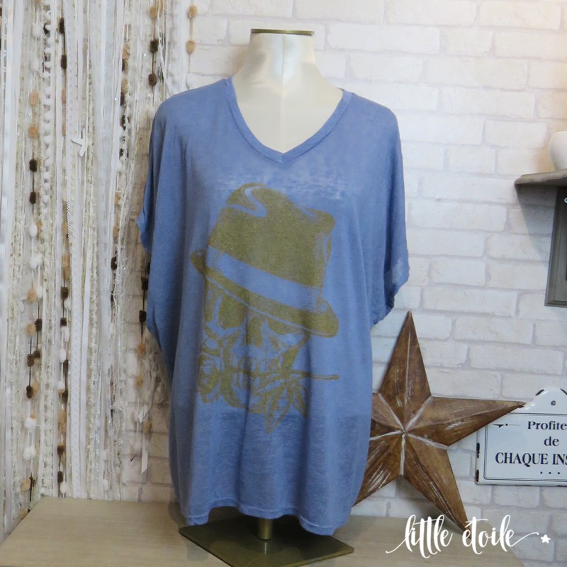 Top Tunique oversize Tête de mort dorée, chapeau & rose, grand col V, aspect gaz, bleu denim