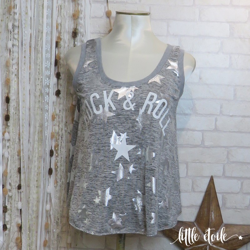 Le fond est gris chiné, étoiles argentées et inscription Rock & Roll et étoile en blanc