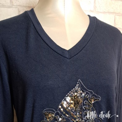 Pull fin doux oversize en viscose, Col V, Broderie Baskets dorées aux sequins argentés, marine