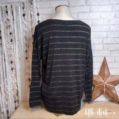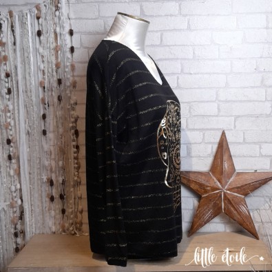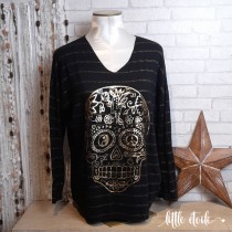 Superbe Pull col V en maille fine ultra doux, Tête de mort mexicaine & rayures dorées