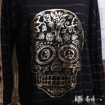 Pull tout doux oversize, Tête de mort mexicaine & rayures dorées, noir