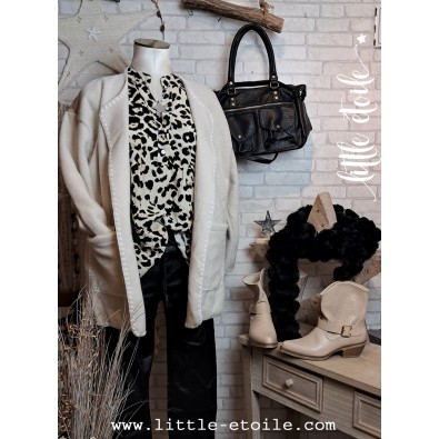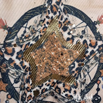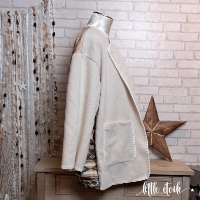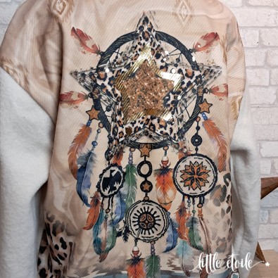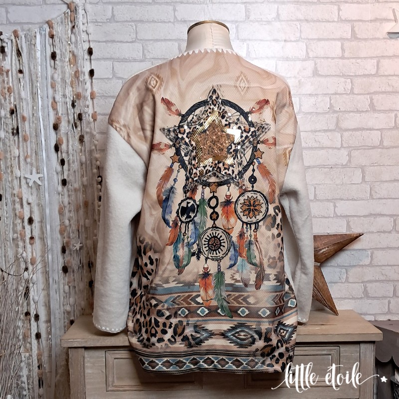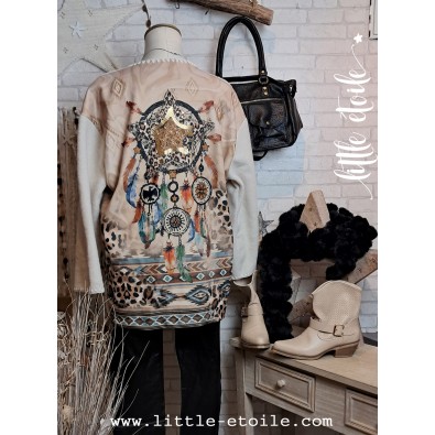 Sublime veste mi longue au dos d'attrape rêves..., Etoile, plumes multicolores, imprimé léopard & détails dorés