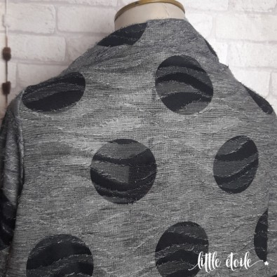 Matière stretch, avec fils argentés cousus en forme de vagues, sur fond de pois noirs
