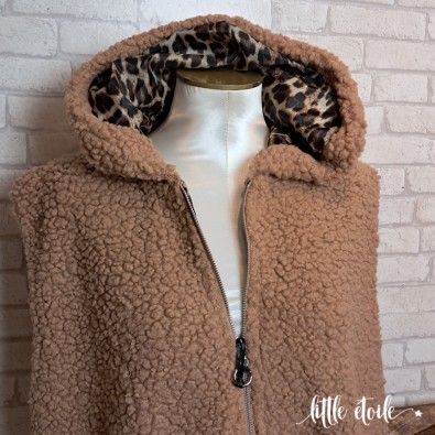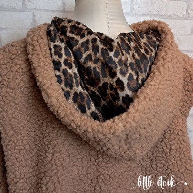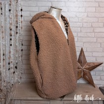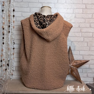 Très beau gilet sans manches ou veste en fausse fourrure, capuche & intérieur léopard effet soie